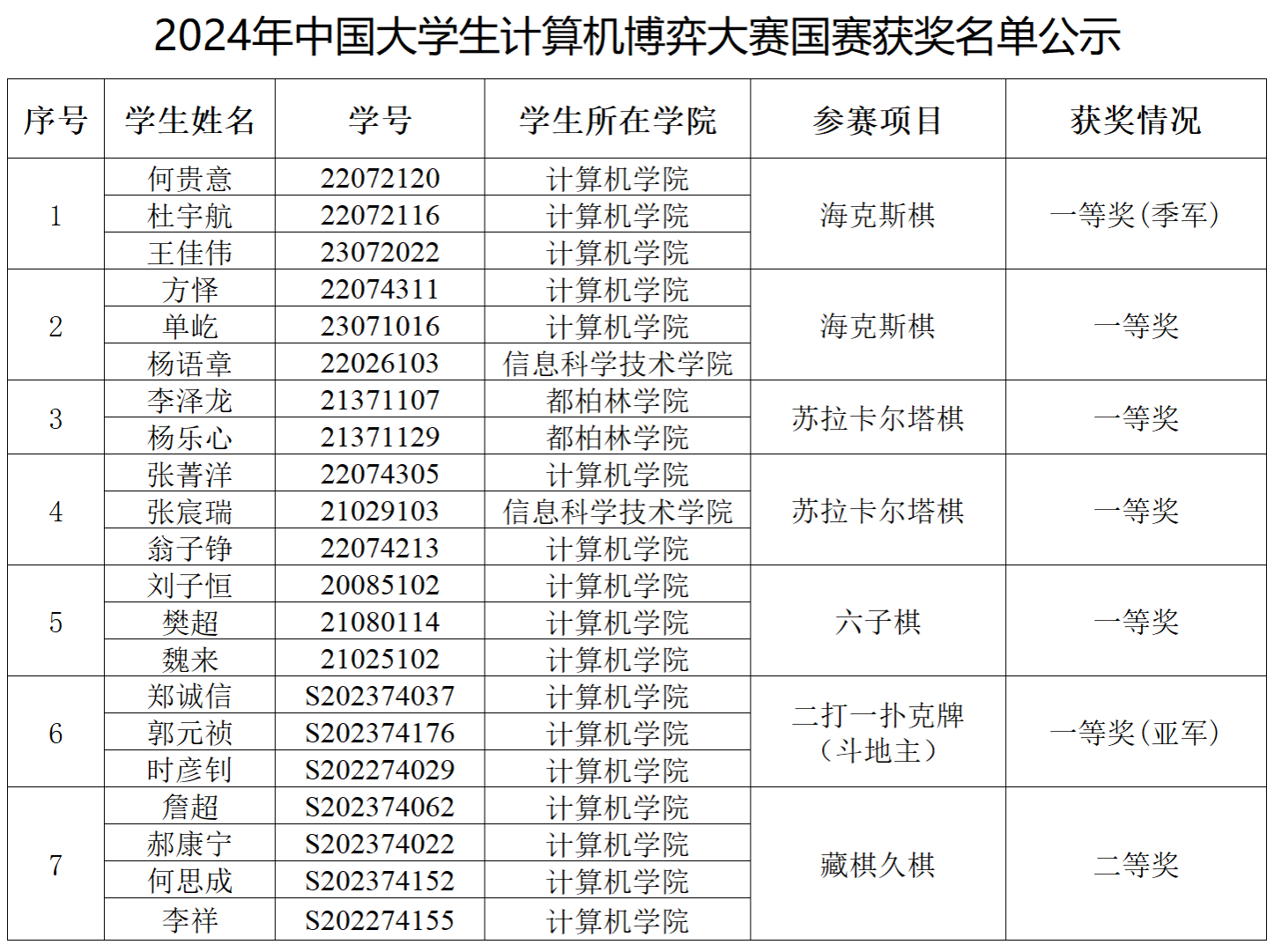 2024年7月26日至8月4日,由中国人工智能学会、教育部高等公司计算机类专业教学指导委员会联合主办,中国人工智能学会机器博弈专业委员会协办的2024中国老员工计算机博弈大赛(C2012130,国家级)在青海民族大学顺利举办,来自全国61所高校的442支决赛队伍入围本次大赛,公司代表队获得了6项一等奖,1项二等奖,其中二打一扑克牌项目获得亚军,海克斯棋获得季军,再获历史佳绩。以下为2024中国老员工计算机博弈大赛北工老员工获奖名单。
