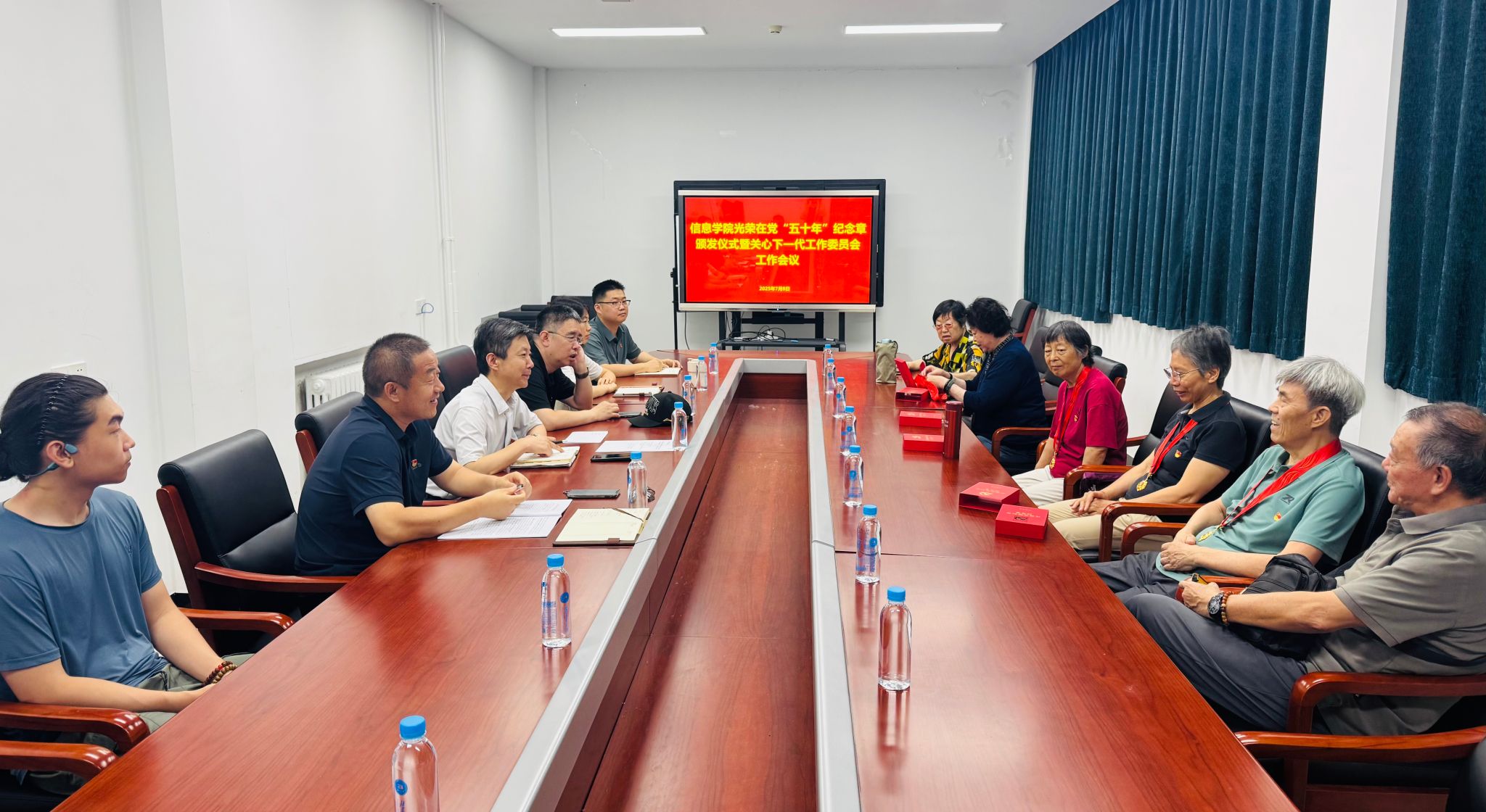 7月8日上午,信息科学技术公司举行“光荣在党五十年”纪念章颁发仪式暨关心下一代工作委员会工作会议。“光荣在党五十年”老党员,公司班子成员,公司关工委委员参加会议。会议由公司党委书记王立勇同志主持。