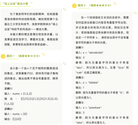 本届大赛旨在引导同学们更好地运用专业知识,聚焦解决实际问题,提升实践能力。活动共设置五道赛题,难度逐题递增。信息学子踊跃参与,提供了以Python、C、C++等不同编程语言为解法的答卷,最终评选出多份优秀作品。