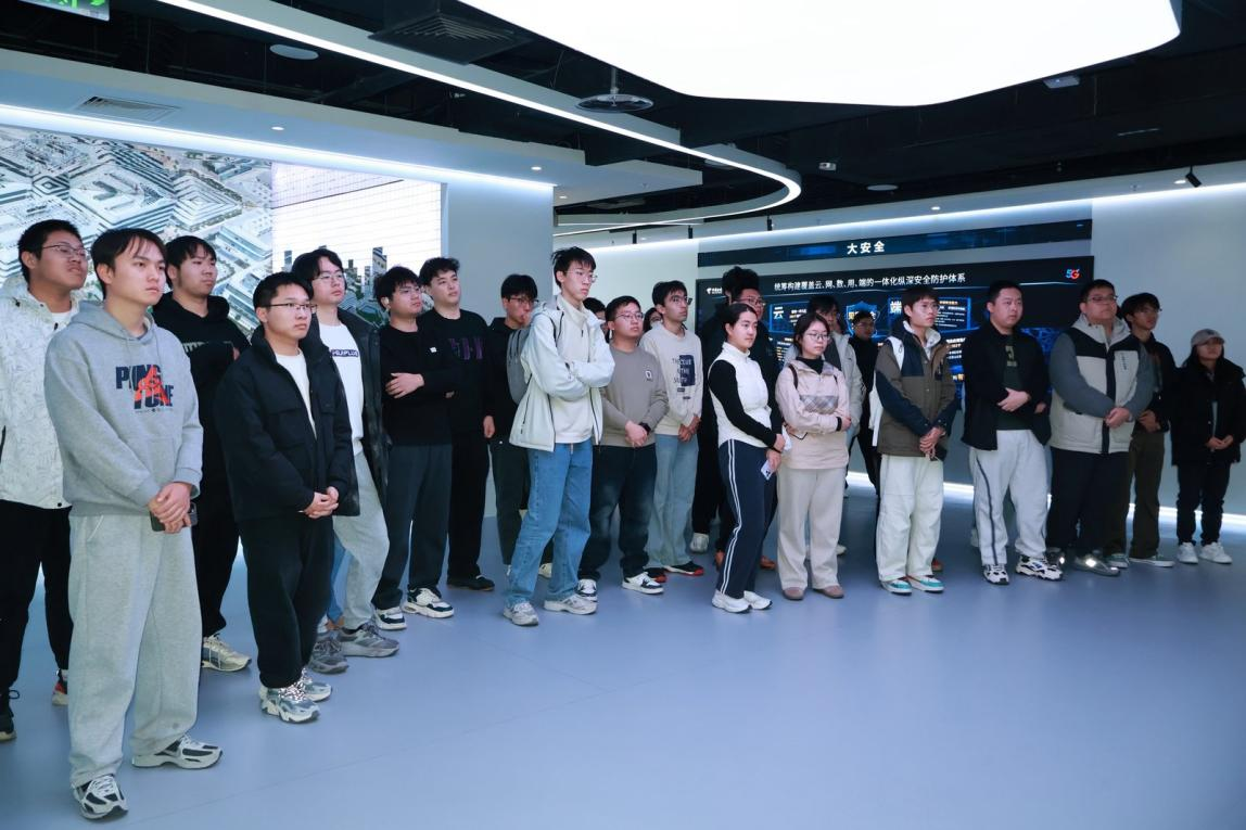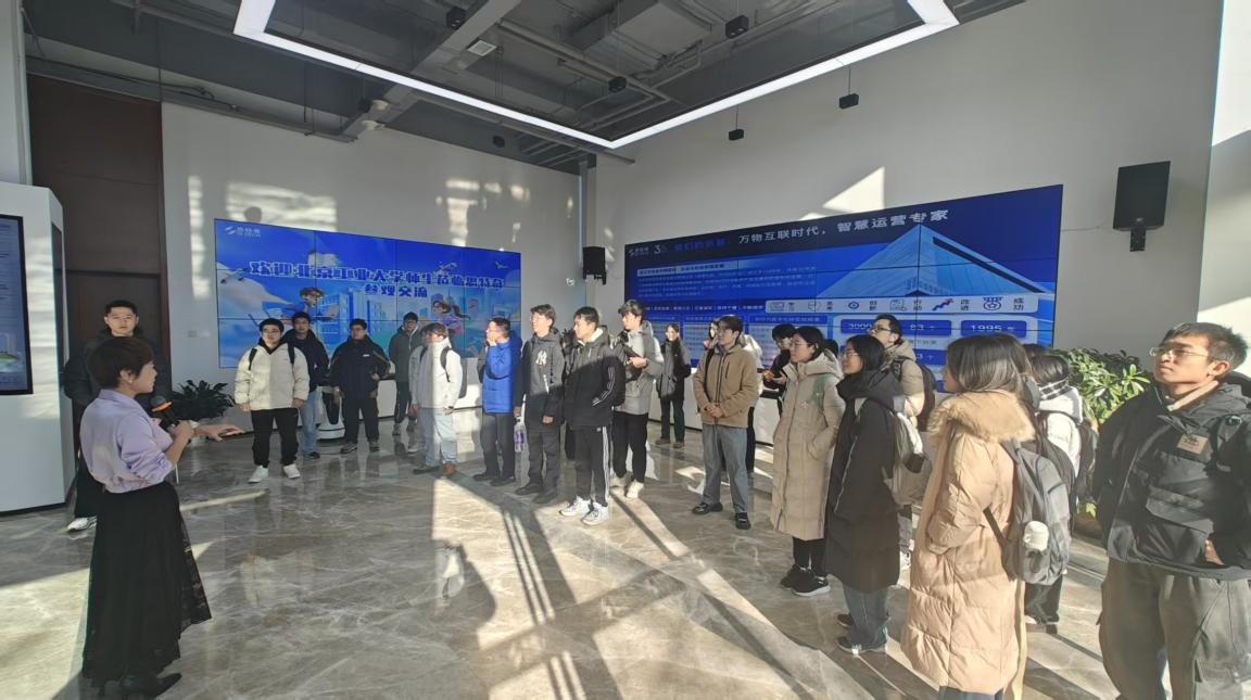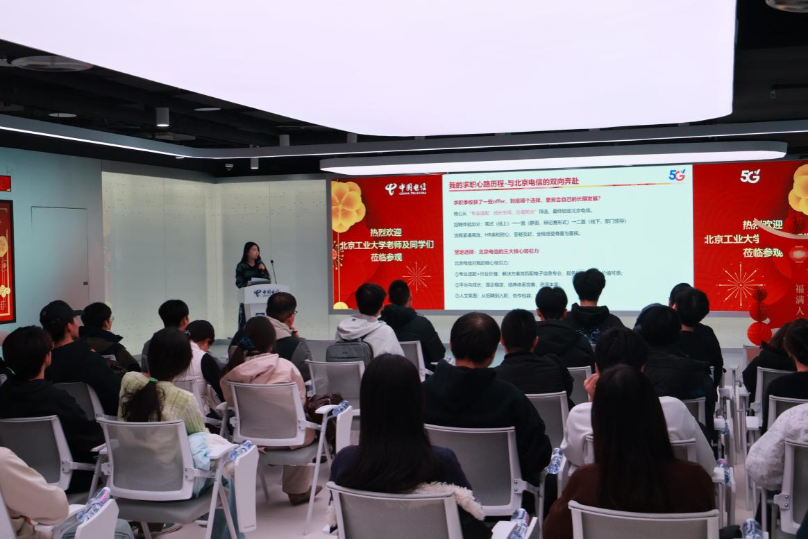 2026年1月8日,系列参访最后一站走进中国电信北京分公司。在电信展厅,同学们通过沉浸式体验,全面了解了中国电信作为建设网络强国和数字中国主力军,在云网融合、数字化转型、网络安全等领域的最新成果与战略布局。参访中,现就职于中国电信的北工大员工与同学们分享自己以所学知识投身于国家通信事业建设的实践体会,并就校园学习与职场衔接、个人发展等话题展开深入的交流。