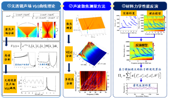 2. 创新性构建了一种新型无透镜线聚焦声场中V(z)曲线的理论分析模型,重点突破了多模态信号分离和材料弹性性质反演方法,为超声法测量功能梯度、各向异性及镀/涂层材料弹性性质提供了解决方案。