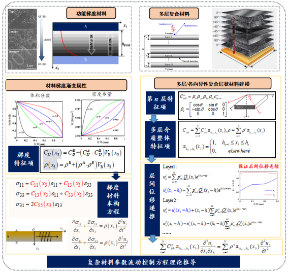 1. 建立了性质呈连续性变化的功能梯度材料的不分层建模方法,发展了复杂多层/各向异性复合材料超声传播理论分析模型,为解决材料属性梯度渐变及复杂边界的波传问题建模提供了新途径。提出了一种全新的基于特征谱的状态矩阵联合勒让德级数分析方法,创新性地系统构建了复杂结构中超声导波传播特性理论求解体系,有效解决了传统矩阵法存在的漏根、伪根和模态追踪错问题。