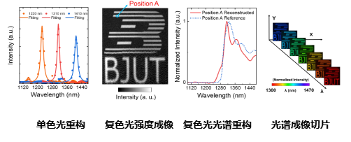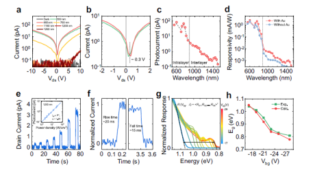 代表性成果1:研究了电场调控范德华异质结超微型光谱仪,该光谱仪在可见光波段表现出较高响应,在近红外波段产生明显响应,引入夹层Au的器件比无Au器件响应大2倍,近红外展现出功率依赖的线性变化关系,且响应速度约为15 ms,基于此实现了小于10 μm的超微型光谱仪成像。